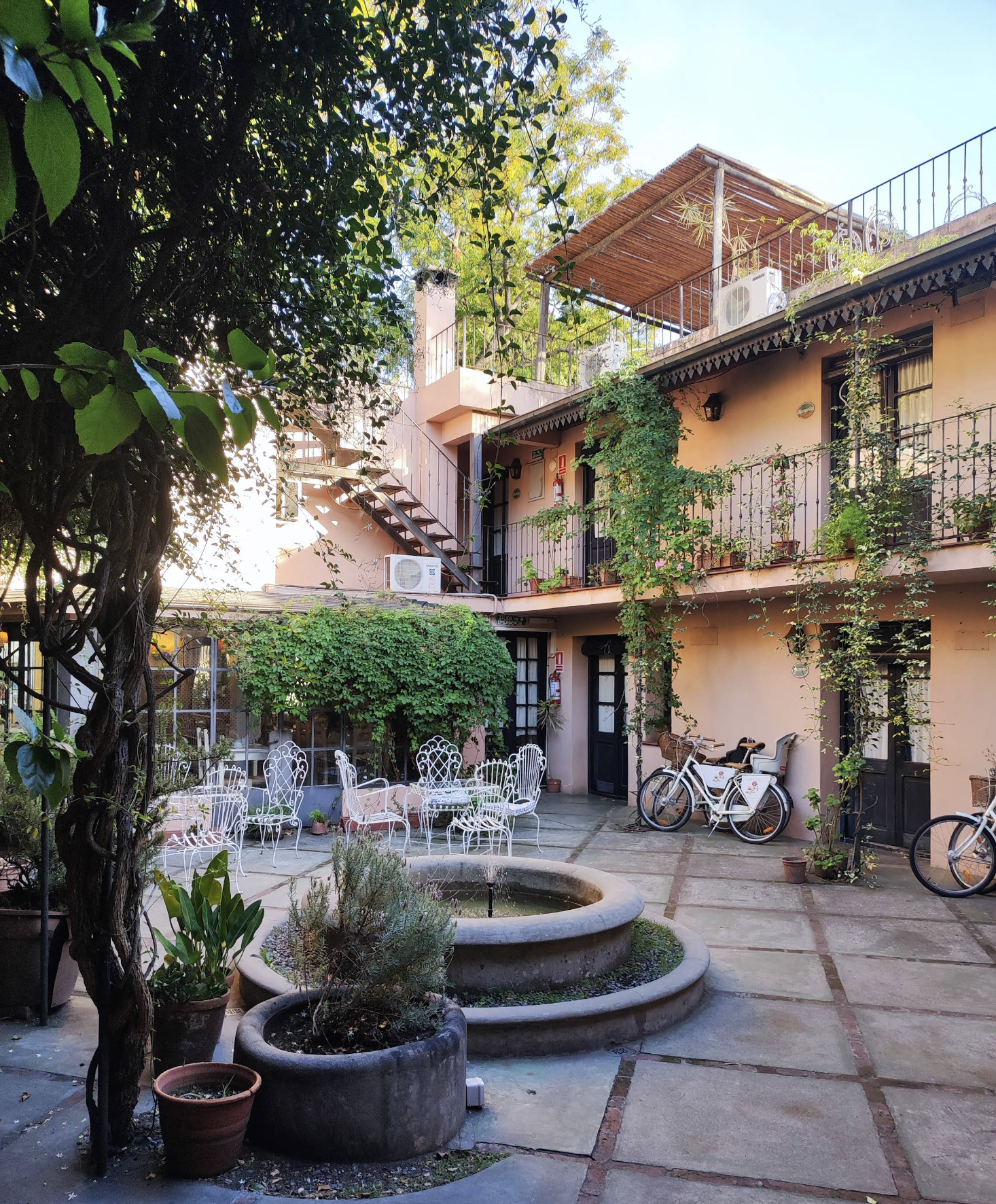 Embellished with a fountain and antique tables and chairs that immerse you in a colonial atmosphere.